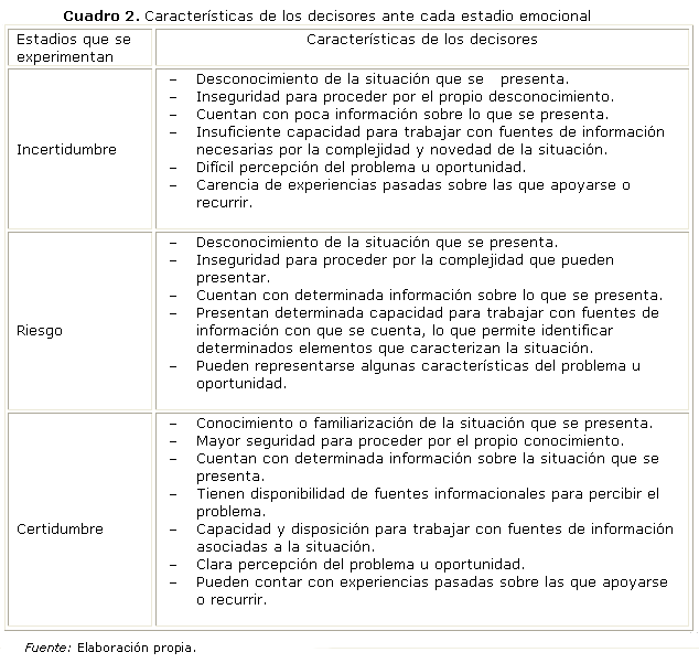 De acuerdo con lo planteado, los decisores presentan características particulares ante cada situación y estadio emocional, como se muestra en el cuadro 2.