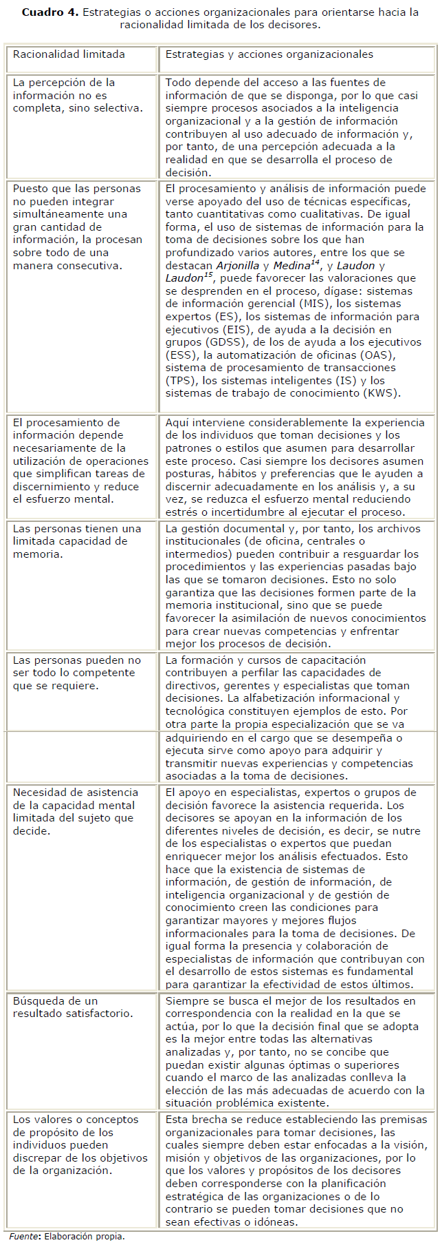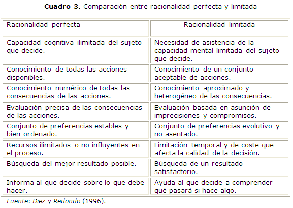 Todo lo expuesto anteriormente permite esclarecer un poco más al respecto, aunque pueden surgir y potenciarse más estudios para profundizar sobre este tema. Lo cierto es que la racionalidad limitada permite que se pueda comprender la naturaleza de los individuos al tomar decisiones, y basado en esto contribuir a asegurar y reforzar esas aparentes debilidades que se tienen a la hora se desarrollar este proceso; pero este reconocimiento no debe partir de la comparación con la racionalidad absoluta. Un acercamiento a lo planteado se puede visualizar de la siguiente forma (cuadro 4):