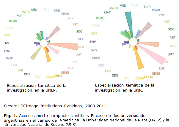 En un estudio más exhaustivo y que incluyó cuatro campos temáticos, se analizaron los artículos de autoría de investigadores argentinos publicados en revistas indizadas en SCOPUS en el período 2008-2010. Las autoras encontraron que Argentina tiene un gran potencial para liberar un importante porcentaje de su producción en acceso abierto: el 27 % por la vía dorada y el 43 % por la vía verde. No obstante, observaron diferencias entre campos temáticos. En Ciencias Sociales y Humanidades, el 35 % de las revistas elegidas para publicar eran de acceso abierto y un porcentaje similar pertenecía al grupo de acceso restringido que permite autoarchivo. En los otros tres campos temáticos estudiados, sin embargo, encontraron una mayor preferencia por la publicación en revistas con permisos de autoarchivo: en Física y Astronomía (48,5 % vs. 8 % respectivamente); en Medicina (47,3 % vs. 20 %), y en Agricultura y Ciencias Biológicas (38,5 % vs. 17,1 %).19