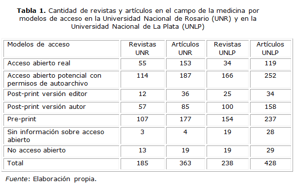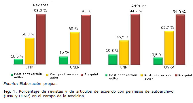 Se concluye que si bien existen patrones generales similares al estudio a nivel nacional, la UNR y la UNLP presentan algunas diferentes en sus patrones de publicación en relación con el acceso abierto. Mientras la primera tiene una mayor preferencia hacia la publicación en revistas de la vía dorada, los investigadores de la UNLP publican mayormente en revistas de suscripción con permisos de autoarchivo. En este sentido, se observa que la UNR sigue la tendencia internacional donde predomina la vía dorada en las áreas de Medicina y las relacionadas.2-3 En lo que respecta al volumen de la producción pasible de ser autoarchivada en repositorios, los porcentajes se asemejan en ambas instituciones y en ambos casos el predominio de las versiones pre-print y post-print del autor son hasta el momento, y por amplia diferencia, las posibilidades dominantes.