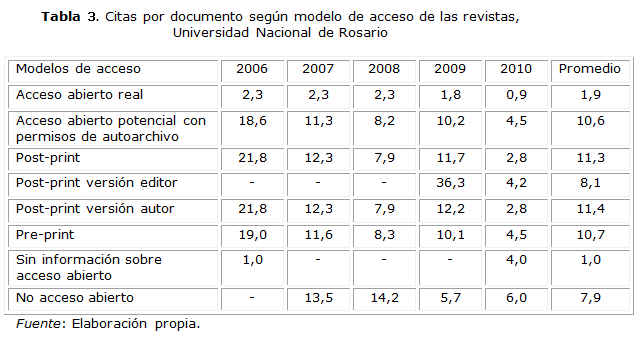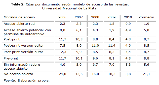 A diferencia de otros estudios que utilizan el indicador de citas por documento a partir de las citas promedio recibidas por las revistas donde dichos documentos fueron publicados, en este trabajo los niveles de citación se calcularon a nivel de los artículos.10 En primer lugar, se obtuvo de la base de datos SCOPUS la cantidad de citas recibidas por cada artículo en el conjunto de las revistas incluidas en dicha base de datos y en el período comprendido desde la publicación del artículo hasta la fecha de la captura de los datos (septiembre de 2012). Luego se calculó el indicador promedio de citas por documento, obtenido como el cociente entre la cantidad de citas recibidas y la cantidad de artículos publicados según el año de publicación y el modelo de acceso de las revistas.