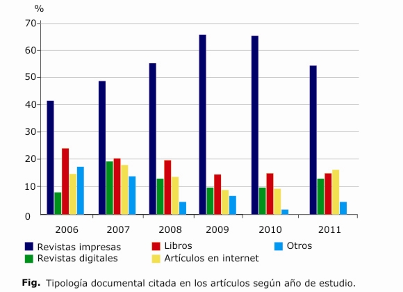 las fuentes predominaron las revistas impresas (59,4 %) seguidas por los libros