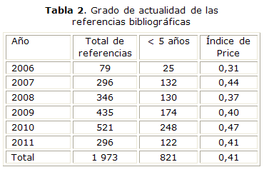 De las 1 973 referencias citadas 1 040 (52,7 %) eran en idioma español, 922 (46,7 %) en inglés y 12 (0,6 %) correspondieron a otros idiomas (portugués, francés y alemán). El índice de Price osciló entre 0,31 y 0,47. El valor promedio para este indicador fue de 0,41 (tabla 2).