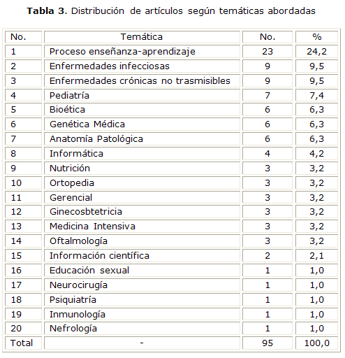 Por el tipo de estudio, 64 fueron descriptivos para un 67,4 %; 17 analíticos (tres tipo casos y controles) para un 17,9 % y 14 de intervención para un 14,7 %. De acuerdo con la temática abordada, el 24,2 % de los trabajos se centró en el proceso enseñanza aprendizaje, mientras que el 75,8 % abordó temas de contenido biomédico variado entre los que se destacaron las enfermedades infecciosas y las enfermedades crónicas no transmisibles (tabla 3).
