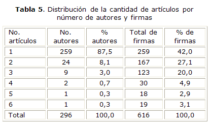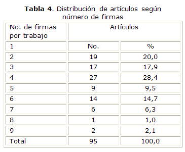 En los 95 artículos participaron 296 autores para un índice de colaboración de 3,1. Predominaron los trabajos con tres firmas (28,4 %) seguido por los trabajos con una (20 %) y dos (17,9 %) firmas (tabla 4).