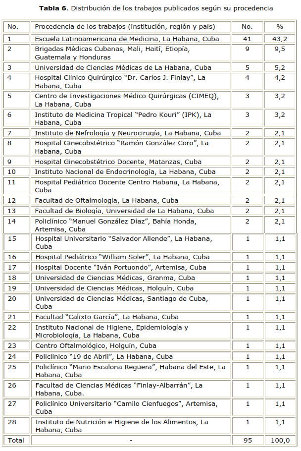 Por la procedencia de los trabajos, 41 (43,2 %) eran de la ELAM, siete de estos en colaboración con otras instituciones (cinco con el Centro Nacional de Genética Médica y los dos restantes con el Centro Internacional de Restauración Neurológica y el Instituto de Nutrición e Higiene de los Alimentos). Los trabajos restantes (54 para un 56,8 %) procedían de otras instituciones nacionales y foráneas, entre las que se destacaron nueve artículos de las Brigadas Médicas Cubanas en diferentes regiones del mundo (Mali, Etiopía, Haití, Guatemala y Honduras) en algunos casos con participación de especialistas de esos países. Entre las instituciones estuvieron representados 26 centros de diferentes provincias y regiones de Cuba. Aportó el mayor número de colaboraciones la Universidad de Ciencias Médicas de La Habana, el Hospital Clínico - Quirúrgico "Dr. Carlos J. Finlay", el Centro de Investigaciones Médico-Quirúrgicas (CIMEQ) y el Instituto de Medicina Tropical "Pedro Kourí" (tabla 6).