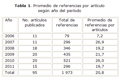 El promedio de referencias por artículo, exceptuando el año 2006, se comportó de forma adecuada. Varios trabajos consultados reflejan como deseables al menos 20 citas o más por artículo,5 pero no existe una norma establecida al respecto, si bien se considera más importante la calidad y la actualidad de las fuentes citadas.10 Para un artículo original, entre 15 y 20 referencias reconocidas por su rigor y vigencia adecuada, podrían ser suficientes. Sin embargo, los trabajos de revisión deberían contar con un número mayor de bibliografías pertinentes, bien seleccionadas, cuyo número podría variar en dependencia del tema y objetivo específico que se persiga.