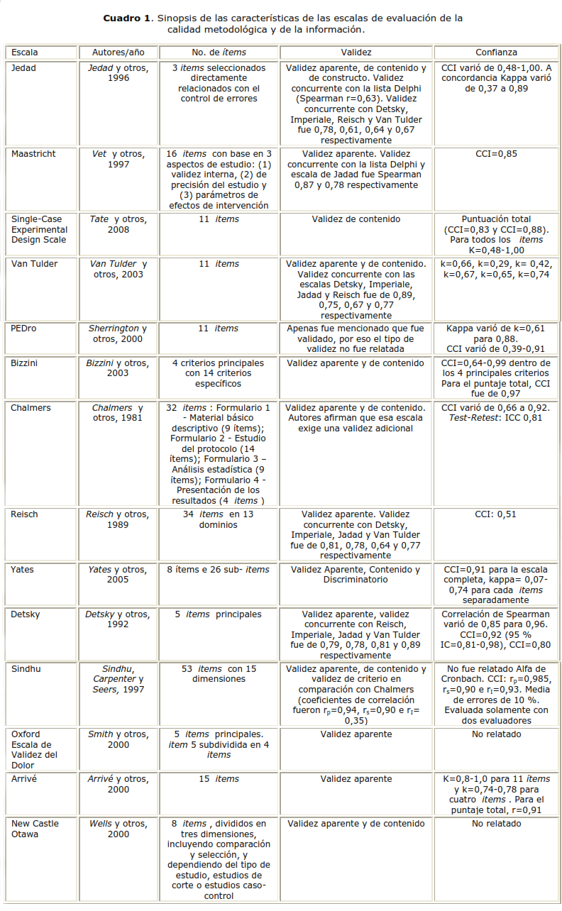 - Escala Chalmers,27 evalúa la calidad por medio de 32 ítems. El puntaje evalúa dos dimensiones de la calidad (generalización interna y externa de validez) con puntuaciones máximas de 88 puntos.27-29 Fue analizada la validez aparente y de contenido, y por eso esta escala exige una validación adicional. En relación con el CCI, hubo una variación satisfactoria a excelente, y en el test-retest fue excelente.