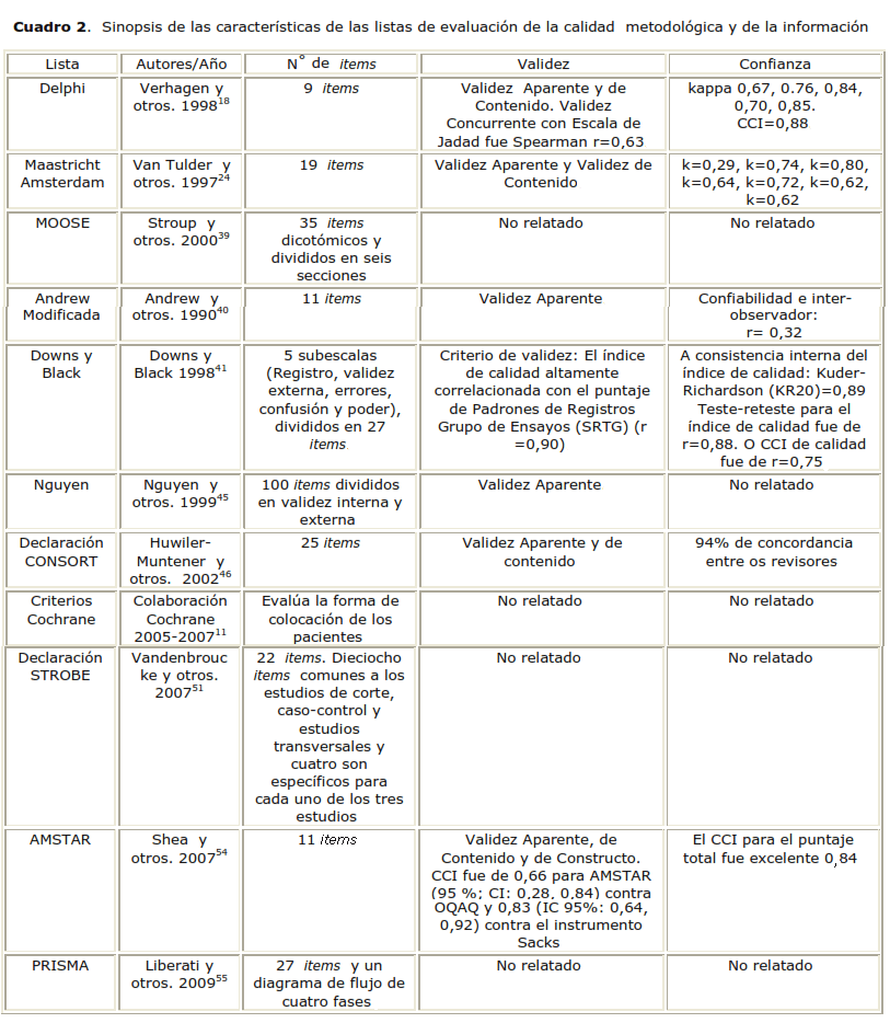 Considerando los resultados presentados, se constató la aparición de 14 escalas (incluyendo sus modificaciones) y 11 listas. Con todo esto, se puede verificar que apenas 14 escalas (Jadad, Maastricht, PEDro, Van Tulder, Bizzini, Chalmers, Reisch, SCED, Andrew Modificada, Yates, Detsky, Sindhu, Downs y Black y Arrivé) y 4 listas (Delphi, MAL, CONSORT y AMSTAR) presentaron propiedades psicométricas (validez y fiabilidad) debidamente investigadas. Se puede identificar que la escala de Jadad presentó la mejor evidencia de validez y fiabilidad, porque fue testada en diferentes contextos, y en conjunto con la Lista Delphi se tienen pruebas de mayor validez en comparación con las otras escalas y listas (MAL, Van Tulder, PEDro y Bizzini). En tanto, la Lista Delphi carece de consistencia interna y validez de constructo. Estas propiedades psicométricas son relevantes porque indican que la construcción, en este caso la calidad metodológica, está totalmente representada por los ítems de la escala (consistencia interna), y que los puntajes de una escala deben ser adecuados con base en hipótesis pre-definidas.5,56 Las listas MOOSE, Criterios Cochrane, STROBE y PRISMA no presentaron las propiedades psicométricas, y las escalas Nguyen, Oxford y NOS solo relataron la validez.