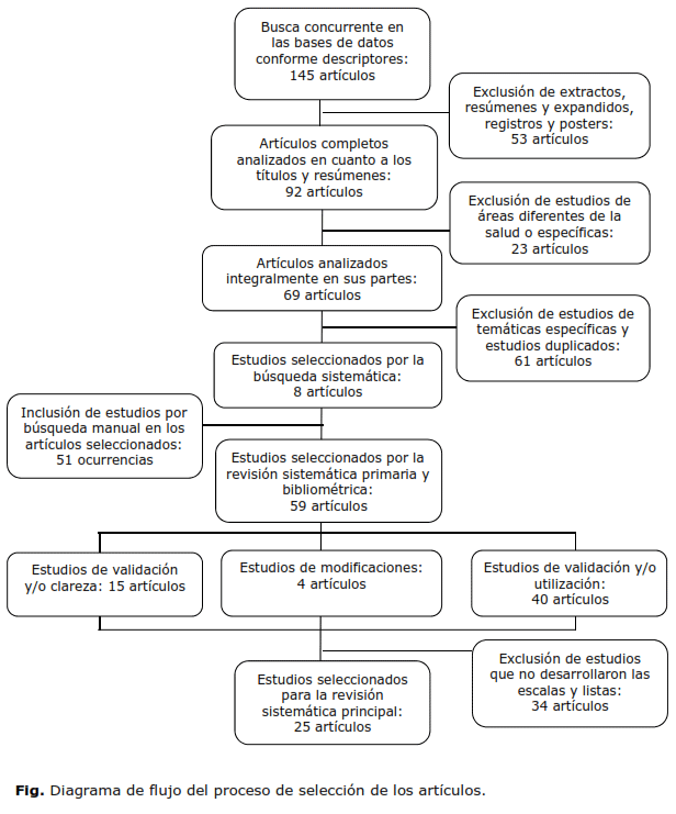 Fueron realizados dos procedimientos para identificar los estudios: a) revisión sistemática; b) revisión bibliométrica. En la revisión sistemática se identificaron los estudios a partir de criterios de inclusión que visaban la obtención de artículos completos, con titulo indexado en la lengua inglesa, producidos entre los años 2007 y 2012, provenientes del área de la salud. Los criterios de exclusión fueron utilizados para descartar los artículos que no presentaban informaciones suficientes, principalmente cuanto a sus propiedades psicométricas. La búsqueda fue estandarizada y realizada por dos revisores independientes (FCS y RS) que procedieron inicialmente a la lectura de los títulos, después de los resúmenes, y finalmente del artículo integral. Los artículos reconocidos después de la lectura integral fueron recuperados y en caso de divergencias en la obtención de los estudios, los procedimientos fueron inversamente repetidos por ambos revisores hasta que fueran corregidas las discrepancias.