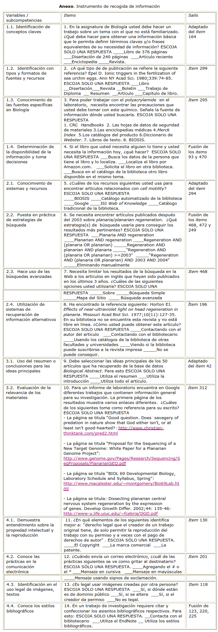 En la primera etapa de este trabajo se estudiaron las competencias informacionales mediante 14 variables o subcompetencias a partir de las Normas de la ACRL para la Ciencia y la Tecnología.23 Para esto, con previa autorización por parte de la jefa del proyecto Carolyn J. Radcliff, se tomaron 14 items del test SAILS para la Biología. Se escogió este por enmarcarse en situaciones reales de disciplinas específicas. Cada item midió una subcompetencia informacional; la selección de estos fue el resultado del trabajo conjunto con bibliotecarios de la facultad (anexo). El formato de respuesta de estos ítems fue de elección múltiple, donde entre más de dos alternativas se eligió la que se considera correcta. Por tanto, el nivel de medición empleado fue nominal, donde se obtuvieron dos categorías del ítem o variable (dicotómico), y se cuantificó con 1 el acierto y con 0 el error. "Un ítem codificado 0 indica una contestación incorrecta en una habilidad o prueba de conocimiento ; un artículo codificado 1 indica una contestación correcta en una prueba de habilidad . Estos son los términos usados en escalas dicotómicas. Muchas investigaciones han asumido el ítem Response Theory, con escalas dicotómicas, y la mayoría han anotado las respuestas de esta manera".24