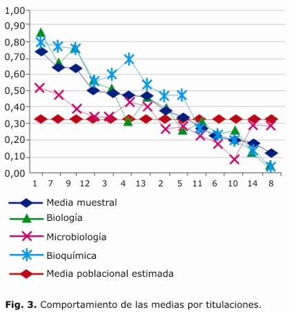 Al comparar de manera general las titulaciones, a partir del estado de las subcompetencias, se pudo observar que la titulación de Microbiología es la que más se distanció de las restantes (Fig. 3).