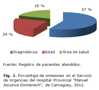 En el caso del Servicio de Urgencias del Hospital Provincial de Camagüey, las negligencias más notables en cuanto al registro de los datos primarios recayeron sobre los diagnósticos, ya sean los concernientes a las especialidades clínicas o los representativos de las quirúrgicas, mientras que las relativas a la edad de los pacientes y al área de salud manifestaron un comportamiento más moderado (Fig. 1).