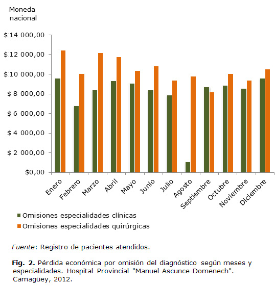 Un análisis del costo por omisión del diagnóstico según las especialidades clínicas y quirúrgicas refleja índices elevados a lo largo de todo el año 2012; ligeramente menores en el caso de las clínicas, que en el mes de agosto refieren la más baja pérdida económica, mientras que en octubre sobrepasan a las quirúrgicas. En el caso de estas últimas, las cifras se mantienen en alza continua durante toda la etapa en estudio. Los meses de enero, marzo y abril son los que exhiben los peores resultados (Fig. 2).