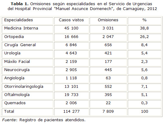 En relación con los casos atendidos en el Cuerpo de Guardia durante el año 2012, según los registros existentes en el Departamento de Estadísticas del Hospital Provincial, se observó que la omisión de datos primarios en los modelos afectaba fundamentalmente a las especialidades de Medicina Interna, Ortopedia, Cirugía y Otorrinolaringología (tabla 1). En esto incidió la sobrecarga laboral a la que se veía sometido el personal médico que atiendía dichas áreas. Las especialidades en las que se verificó una menor incidencia de omisiones fueron las de Máxilo Facial, Angiología y Quemados.