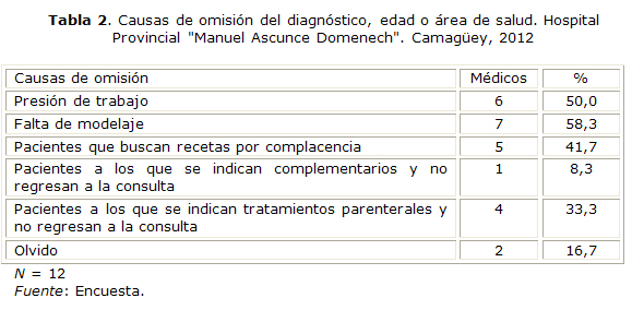 En el caso del Hospital Provincial de Camagüey, el aumento de la presión de trabajo se convierte en una de las principales causas de omisión del diagnóstico, edad o área de salud. La falta de modelaje oficial también repercute significativamente en esto.