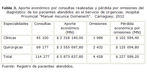 En el caso del hospital en cuestión, se observa que a pesar del aporte sustancial por concepto de consultas médicas efectuadas durante el año 2012, hubo una pérdida económica considerable como resultado de las omisiones del diagnóstico, tanto en lo que atañe a las especialidades clínicas como a las quirúrgicas.