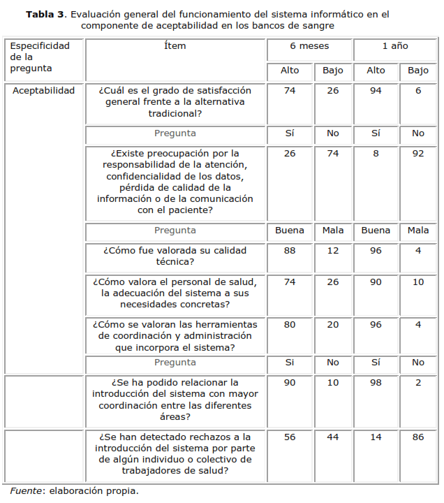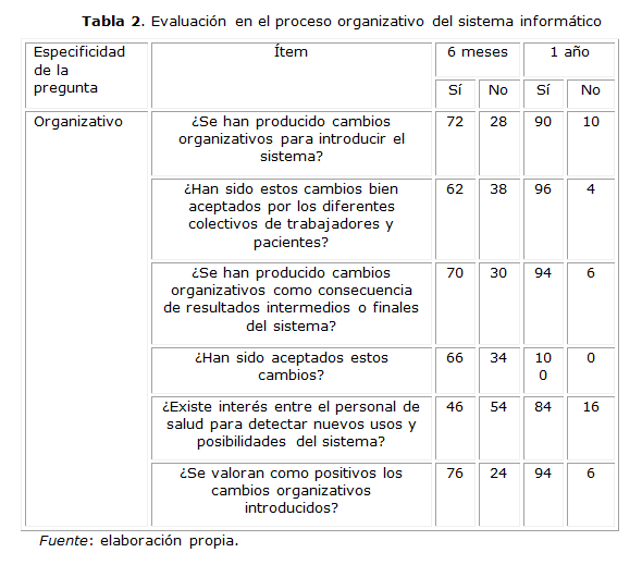 Finalmente, al explorar si se habían detectado rechazos a la introducción del sistema por parte de algún individuo o colectivo de trabajadores de salud a la introducción del sistema, el 54 % respondió afirmativamente a los seis meses de introducido el sistema, y al año solo el 14 % respondió afirmativamente.