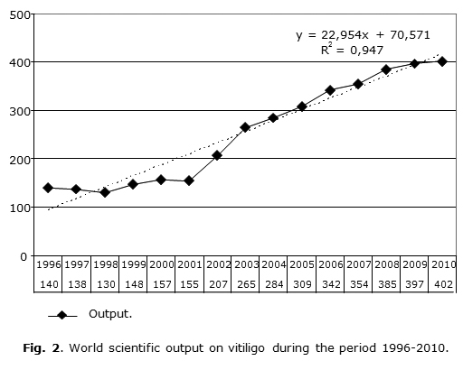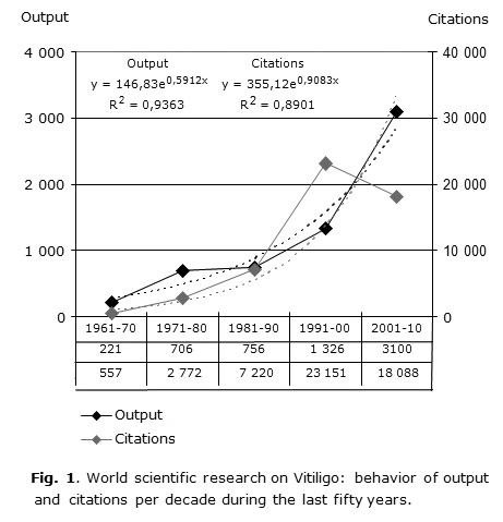 The world scientific output on vitiligo has experienced an exponential growth during the last fifty years. From the 6 109 documents published during the studied period, 3 100 articles (50,7 %) belong to the last decade (Fig. 1). The same behavior was also observed in the citations growth, despite 38,2 % of articles published during the last decade belong to the period 2008-2010. These results provide clear evidence of a research field in progress, no matter the limited citations coverage of Scopus (1996-2011).