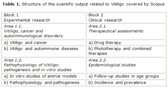 The bibliometric approach allowed the structural analysis of a large amount of data (6 109 papers) in a relatively short time. The applied methodology, using the CONCOR algorithm for the analysis of keywords co-ocurrence in the articles, offers a valid tool for information clustering, description and classification in different knowledge domains. In this sense, the international scientific research on Vitiligo was characterized. It was possible to obtain a macrostructure of the domain, which can be further validated through documental analysis and literature reviews.