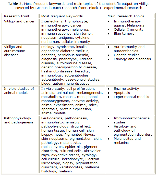 The main concerns related to the disease are implicit in the clusters obtained: It is the most prevalent pigmentary disorder; it is related to genetic and non-genetic factors; the pathogenesis still is not understood, which is the reason of a plethora of different treatments; it is relatively resistant to most of these treatments; coexists with other autoimmune disorders, including thyroid diseases and malignant melanoma; affects seriously the emotional stability, with a major impact on the quality of patients' life; the course of the disease is unpredictable, but often progressive; and the lack of melanin pigment increased the risk of sunburn and skin cancer within the amelanotic areas.12 The identified research fronts are mainly covered by epidemiological studies, therapeutical assessments and experimental exercises to analyze the pathogenesis of the disorder and its relation with cancer and autoimmune diseases. This is in accordance with the most relevant reviews on the disease, which validates the effectiveness of the analytical technique proposed in this paper to characterize the major research efforts developed during the last fifty years.
