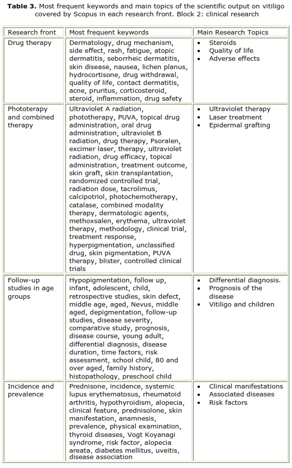 Therapeutical asessment and epidemiology of vitiligo are dominant subjects in the clinical block (table 3). Drug therapy is the first of the areas covered by this block. Steroids, specially hydrocortisone and corticosteroid-based drugs are well studied. Different skin disorders associated to vitiligo are included (atopic, seborrheic and contact dermatitis). There are a large amount of articles related to adverse effects of drug therapy (rash, fatigue, nausea, etc.). Also, studies on the quality of life in patients with vitiligo are covered. The area shows a low citation activity (65-70 % of cited articles), which is probably related to the fact that oral and topical treatments were highly studied in papers published before 1996. The most cited articles studied topical and oral treatments, but were always compared with phototherapies.57-60 Psoralen, calcipotriol, clobetasol, fluorouracil are among the most studied drug therapies.