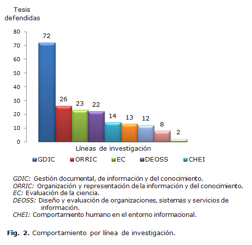 Resulta evidente la primacía en este tipo de investigaciones de aquellas que se dedican a temas relacionados con la gestión documental, de información y del conocimiento (GDIC). Este comportamiento, sin dudas, tiene una estrecha relación con el hecho de que el mayor número de tesis se haya defendido en la última década, período marcado en buena medida por la influencia de este pensamiento gerencial en el campo de la información. En el caso de las tesis ha estado además influenciado por la amplia cobertura que estos temas abarcan en los ciclos de formación, tanto a nivel de pregrado como de posgrado.