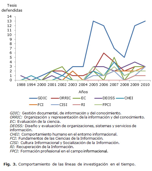 El comportamiento de estas líneas en el tiempo deja una imagen más clara de la investigación por temáticas en este campo en el país. La figura 3 muestra cómo han evolucionado, o no, los distintos aspectos investigados en el transcurso de los años en que se ha desarrollado investigación de posgrado en la esfera de la información en Cuba.
