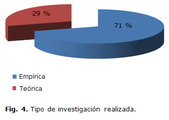El caso de la investigación desarrollada a nivel de posgrado en el campo de la información en Cuba, refleja un comportamiento en el tipo de investigación que se corresponde con lo planteado con estos autores, aunque con algunos matices. Como se observa en la figura 4, el 71 % de los trabajos son de corte empírico y solo el 29 % presenta carácter teórico. Las particularidades señaladas tienen que ver con el hecho de que la mayor parte de estas investigaciones empíricas, si bien toman para el análisis datos provenientes de un objeto de estudio específico y emplean por tanto métodos y técnicas que permiten obtenerlos, mayoritariamente se concretan en propuestas de modelos o metodologías que no permiten generalizar experiencias más allá del contexto específico al que se dirigen, por lo que la mayoría serían investigaciones empíricas, pero no llegan a tener niveles de aplicación en la solución de problemas concretos.