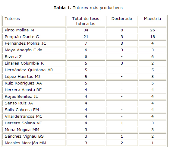 La tutoría de los trabajos de posgraduación es un elemento que no siempre está presente. Las tesis de doctorado, sobre todo aquellas desarrolladas por la "modalidad libre", explicada anteriormente, son en su mayoría investigaciones que se desarrollan sin una tutoría o dirección declaradas. En el caso de la maestría sí es obligatoria la presencia de al menos un tutor que oriente al autor en su investigación. Teniendo en cuenta estas particularidades, el análisis de los tutores de tesis se realizó tomando de conjunto todas las tesis de posgrado. La tabla 1 muestra aquellos tutores con más de tres trabajos dirigidos, y entre ellos dirigen 126 trabajos, o sea, el 84,6 %, teniendo en cuenta que siete trabajos de doctorado no advierten tutor de la investigación. Este resultado refleja una alta concentración en la tutoría de trabajos de este tipo, lo cual está igualmente en correspondencia con la cantidad de doctores y másters formados en el país, que son los que pueden fungir como directores de tesis. En este grupo de tutores se encuentran además ocho profesores de la Universidad de Granada, en tanto investigaciones desarrolladas como parte del Programa Doctoral, específicamente en la fase de realización de Diplomas de Estudios Avanzados, han sido presentadas además para la obtención del título de Máster en Bibliotecología y Ciencia de la Información.