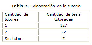 El resultado que se obtiene indica que no existe mayoritariamente un comportamiento que indique niveles de colaboración en esta actividad. Del total de tesis que declaran tutores (149), 127, o sea, el 85,2 %, son dirigidas por un solo tutor. Solo en 22 trabajos se trabajó con colaboración en la dirección de la investigación (tabla 2).