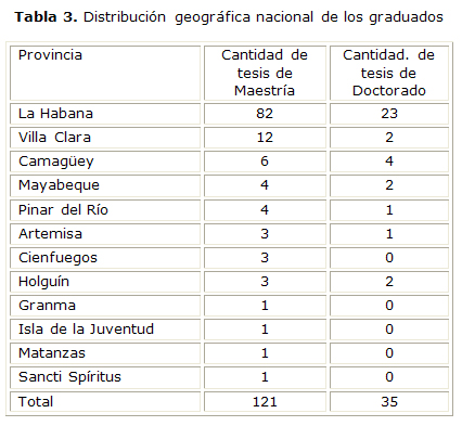 Conocer la ubicación regional de los graduados del posgrado en el campo de la información en Cuba permite dilucidar el desarrollo de la especialidad a lo largo de la geografía nacional. La formación posgraduada constituye un elemento que garantiza mayor nivel de profesionalización, por lo que mientras más extendidos nacionalmente se encuentren aquellos que consigan concluir estudios de este tipo, mayor nivel de desarrollo tendrá la especialidad en las diferentes regiones del país. En este sentido, como se observa en la tabla 3 se han desarrollado esfuerzos por incorporar en estos programas de posgrado a representantes de las distintas provincias del país. No obstante, es amplio el sesgo entre los graduados de la capital y el resto del país, a lo que contribuye el hecho de que la formación posgraduada, en todas sus etapas (Maestría y Doctorado) ha sido desarrollada hasta el presente solo en la capital del país, específicamente en la sede de la Facultad de Comunicación de la Universidad de La Habana.