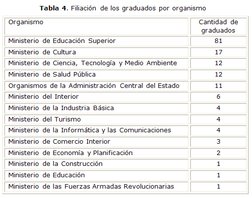 Ampliar la representación de graduados de estos dos niveles en las provincias, actualmente con muy pocos representantes, debe constituir igualmente objetivo priorizado. A la representatividad geográfica nacional se suma el análisis de los organismos a los que pertenecen los másters y doctores graduados, realidad que se refleja en la tabla 4.