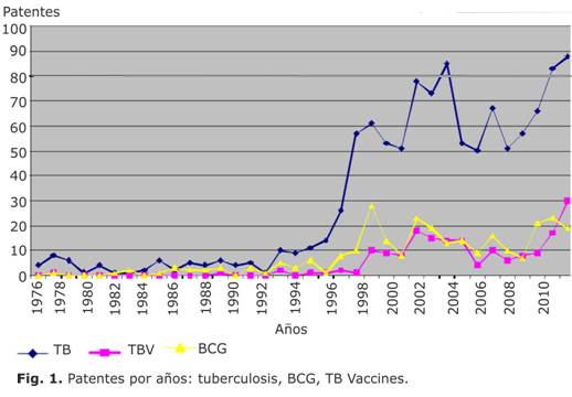 A partir de la reemergencia de la TB y de su aparición en países ricos, se comenzó a invertir más financiamiento para su investigación, lo que favoreció varios descubrimientos importantes en la década del noventa que catapultaron la concesión de patentes. Se alcanzó el primer pico de productividad tecnológica en el año 1998. En esta época también se publicó en la prestigiosa revista Nature el primer artículo sobre la Secuencia del Genoma de la Tuberculosis;4 se obtuvieron nuevos arreglos de DNA por Kaufmann junto a otras investigaciones con gran mérito científico.5-8 El desarrollo de todas estas investigaciones sementó las bases para una posterior explosión de patentes en la década del 2000.