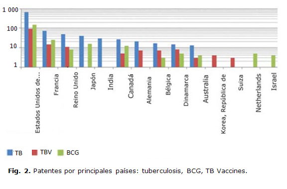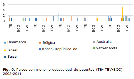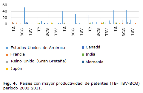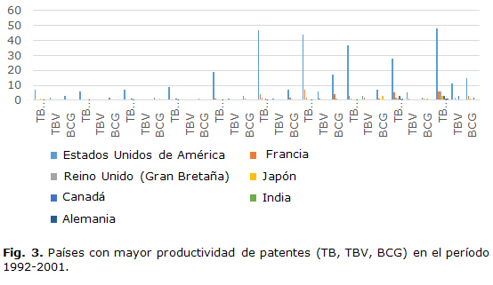 El comportamiento de los principales países con mayor y menor productividad tecnológica en las temáticas TB, BCG y TB Vaccines se muestra en la figura 3, en la que se manifiesta que las patentes en TB Vaccines comienzan a ser concedidas de forma más regular desde finales de la década del noventa.