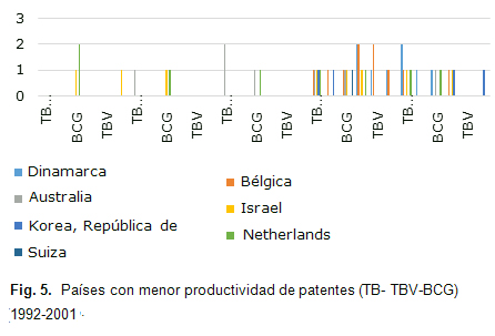 La figura 5 muestra el comportamiento de algunos países seleccionados como de menor productividad, ya que no fue hasta el año 1992 que comenzaron a tener resultados tecnológicos patentables sobre TB y BCG.