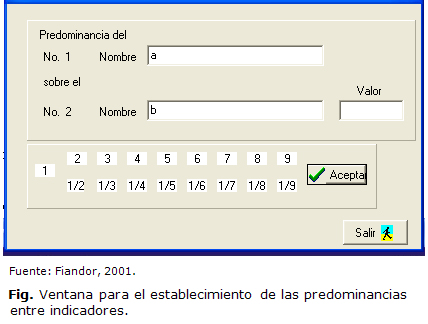 Con el PROPONE se aligera la aplicación del método de Saaty, ya que la comparación se realiza en pares, de uno contra todos (Fig. 1) y se selecciona el valor al dar un clic en el lugar donde este se muestra. Automáticamente aparece el resultado de la acción en la entrada del valor, y se acepta. Sucesivamente, va comparándose el primer indicador con el resto hasta el número total de estos, previamente definido. Al concluir, la aplicación informa que terminó los cálculos y le pide que salve los resultados.