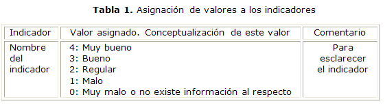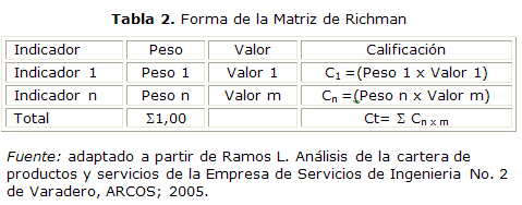 En la tabla 1 preparación para el uso de la Matriz de Richman se muestra el conjunto de indicadores que seleccionó el grupo expertos. Como se observa, se establecen valores de 0, 1, 2, 3 y 4 para cada indicador con su significado correspondiente. Así, el indicador 1 tendrá valor 4 solo si es «muy bueno» en los elementos que seleccionó el grupo de expertos como representativos de la actividad con los proyectos de ciencia e innovación. Se basa en la opinión de los expertos antes seleccionados.