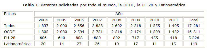 En el período 2004-2011, 89 países solicitaron, vía PCT, 17 281 patentes en Inmunología. En 2007 se produjo el mayor número de solicitudes, a excepción de Latinoamérica, cuyo máximo se produjo en 2006. A partir de esta fecha, las patentes en Inmunología han disminuido en prácticamente todos los países; los que integran la Organización para la Cooperación y el Desarrollo Económicos (OCDE) solicitaron el 97,28 % de las patentes, la Unión Europea (UE) el 30,76 %, y Latinoamérica solicitó 149, el 0,86 % de todas las patentes (tabla 1). Los países que más patentes solicitaron fueron Brasil con 43 y Cuba con 31. El 79,27 % de las solicitudes se realizaron por solicitantes de un solo país. La mayor parte (61,64 %) procedía de los Estados Unidos y el 2,20 % de Latinoamérica.