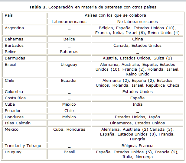 Los países latinoamericanos realizaron 79 cosolicitudes, casi todas con los países de la OCDE, salvo cinco que se solicitaron con otros países, y cinco entre los propios países latinoamericanos. En conjunto, Latinoamérica tuvo un nivel de internacionalización del 53,02 %. La cooperación de los países latinoamericanos con otros países en materia de patentes en Inmunología se describe en la tabla 2. Los países que más solicitudes de patentes realizaron con otros países fueron: Argentina 20, Brasil 19, México 14, Chile y Uruguay 7.