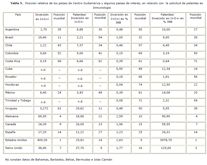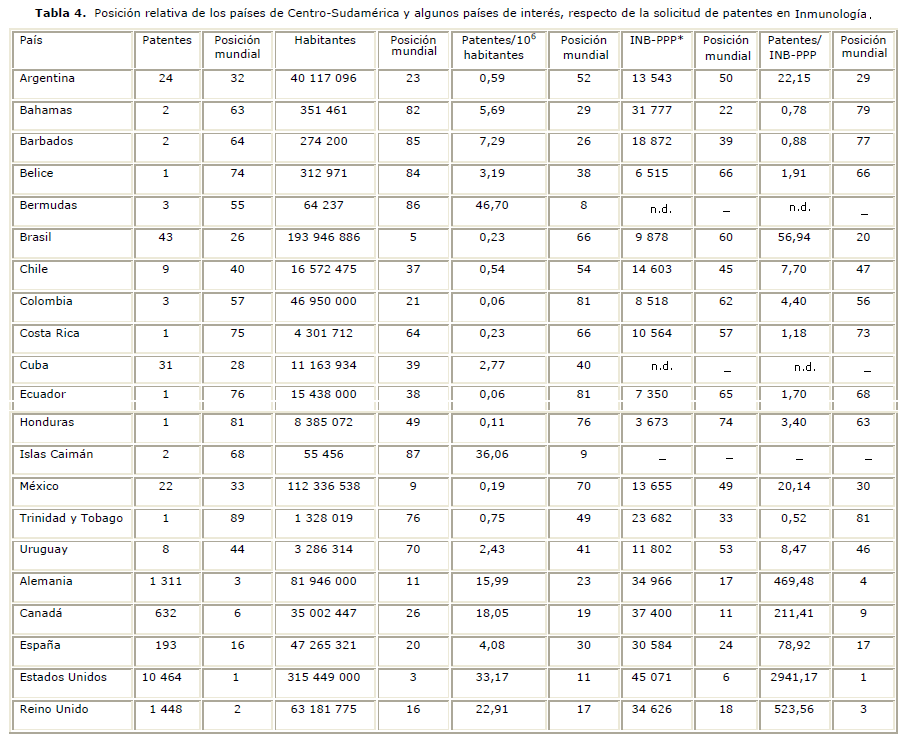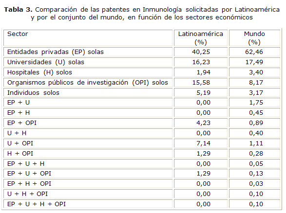 Las diferencias entre Latinoamérica y el resto de los países respecto a las clases tecnológicas de la ISIFhg/OST/INPI (Fraunhofer Institute for Systems and Innovation Research de Karlsruhe-Alemania/Observatoire des Sciences et des Techniques de París/Instituto Nacional de la Propiedad Industrial de Italia) mostraron que las patentes de Latinoamérica se centraban fundamentalmente en: productos farmacéuticos 67,11 vs. 53,14 % en el resto del mundo; Biotecnología 51,67 vs. 52,19 %; en menor medida análisis de materiales biológicos 13,42 vs. 32,71 %; química de los alimentos 4,02 vs. 1,73 % y productos orgánicos elaborados 3,35 vs. 10,06 %.