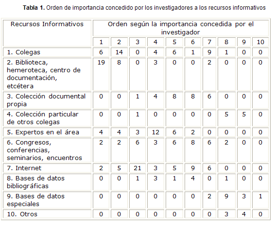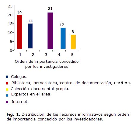 Con la finalidad de satisfacer sus necesidades informativas, los investigadores que integraron la comunidad científica acudieron como primera prioridad al recurso informativo biblioteca, hemeroteca, centro de documentación, con una puntuación de 19 respuestas (57,5 %). Otro recurso de información importante utilizado por ellos cuando precisaron satisfacer sus necesidades informativas, lo constituyó el contacto con colegas, razón por la cual le otorgaron el segundo lugar en orden de importancia con 14 respuestas que representaron el 42,4 % del total. El tercer lugar en la escala de importancia lo ocupó Internet con una puntuación de 21 respuestas (63,6 %), que se corresponde con el incremento del uso de las tecnologías de la información y el conocimiento (TIC) en todas las instituciones participantes en el proyecto. El cuarto y quinto lugares lo ocuparon en orden de importancia los expertos en el área, con una puntuación de 12 respuestas y el rubro colección documental propia, con 8 respuestas respectivamente (tabla 1, Fig. 1).