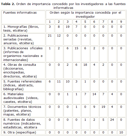 De 33 investigadores, 21 respondieron que las publicaciones periódicas eran las fuentes informativas más utilizadas por ellos para desarrollar sus acciones de investigación dentro del proyecto. Tal aseveración fue corroborada con los resultados obtenidos, pues precisamente este fue el rubro que ocupó el primer y segundo lugares según el orden de importancia concedido por los investigadores.