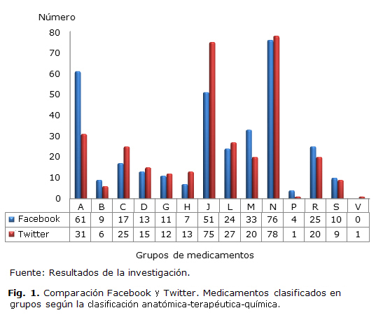 El grupo que predominó en ambas redes fue el N (sistema nervioso), seguido del grupo J (antinfecciosos para uso sistémico) donde Twitter superó a Facebook en 24 medicamentos, y el grupo A (sistema digestivo y metabolismo), donde Facebook dobló a Twitter en número de medicamentos (Fig. 1). El resto de los grupos fueron similares en ambas redes. Los grupos con menor número de medicamentos en ambas redes sociales fueron el P (productos antiparasitarios, insecticidas y repelentes) y el V (varios).