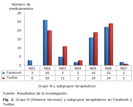 En cuanto al grupo N (sistema nervioso), el más prevalente en ambas redes (Fig. 2), se destacaron los mismos subgrupos terapéuticos: N02 (analgésicos), donde fue superior Facebook, N06 (psicoanalépticos) y N05 (psicolépticos). El número de antiepilépticos (N03) encontrados en Twitter duplicó al número de Facebook.