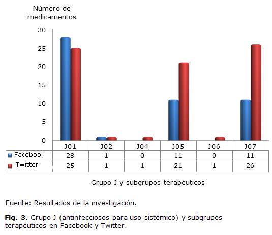El grupo J (antinfecciosos para uso sistémico) predominó en la red social Twitter, donde se destacaron los subgrupos J07 (vacunas), J01 (antibacterianos para uso sistémico) y J05 (antivirales de uso sistémico). En el caso de Facebook sobresalió claramente el subgrupo J01 (antibacterianos para uso sistémico), que fue similar en número de medicamentos a Twitter (Fig. 3).