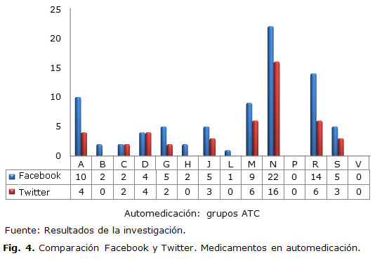 Facebook duplica a Twitter en cuanto al número de medicamentos empleados en automedicación (81 frente a 46), y resulta muy similar el número de medicamentos encontrados no usados en automedicación. Esta observación puede responder a la posibilidad que ofrece Facebook de crear grupos donde pueden participar e interactuar personas con intereses y situaciones similares en relación con problemas de salud y/o enfermedades, y se puede trasmitir información sobre tratamientos, específicamente sobre medicamentos.