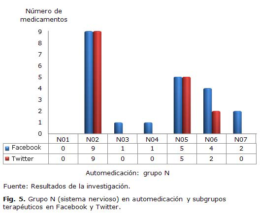 En el grupo donde se obtuvo mayor número de medicamentos en automedicación, el N (sistema nervioso), predominaron por igual los subgrupos terapéuticos N02 (analgésicos) y N05 (psicolépticos) en ambas redes sociales, donde fue más habitual la automedicación con analgésicos. El resto de los subgrupos, con menor número de medicamentos, siempre fue superior a Twitter (Fig. 5).