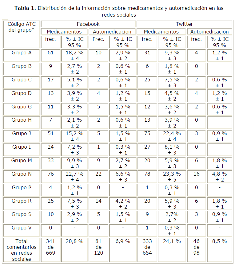 Los resultados obtenidos en ambas redes son similares. Las búsquedas que contienen información sobre medicamentos en Facebook representan un 20,8 % y en Twitter el 24,1 %. De igual forma, sobre automedicación en Facebook suponen el 6,9 % y en Twitter el 8,5 %. En cuanto al número de medicamentos encontrados y clasificados en la ATC, en Facebook es 341 y en Twitter 333.