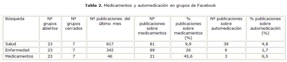 En los grupos abiertos explorados en Facebook, la información sobre medicamentos representó el 58,6 %. El número de medicamentos clasificados por ATC fue 321. La información sobre automedicación supuso el 27,6 % y el número de medicamentos utilizados en automedicación clasificados por ATC, 24. En el caso de los grupos abiertos, las publicaciones realizadas en el último mes y aquellas con información sobre medicamentos y automedicación se recogen en la tabla 2.